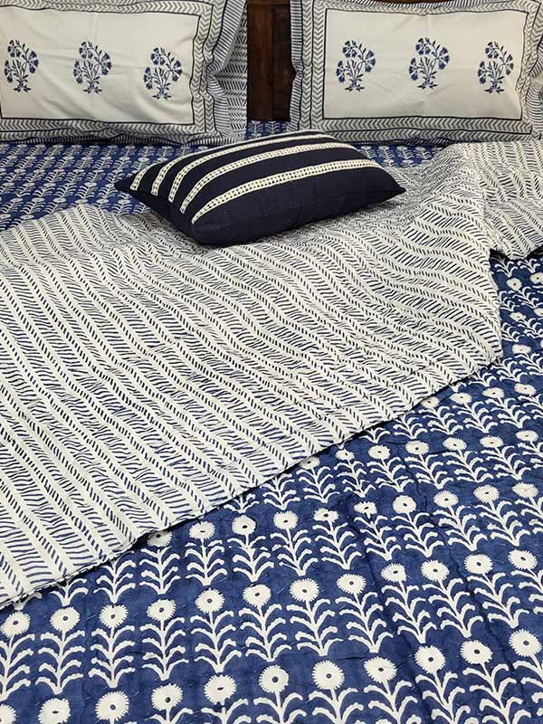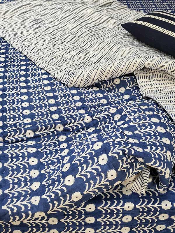 Two layers of hand block printed organic cotton muslin are filled with pure cotton, fluffed and carded the traditional way. Skillful quilting is done in small stitches by women so that the cotton is held well together, and this makes it easy to machine wash the quilt.